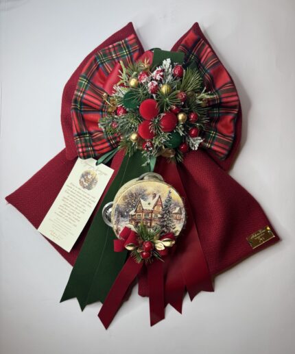 Materiale: tessuto altezza: 40 cm Un raffinato fiocco in velluto tartan e rosso, arricchito da un pendente a tamburello con delicato paesaggio invernale. é l’addobbo perfetto per porte, camini e ambienti da impreziosire con stile.
