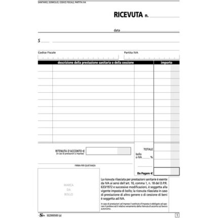 Blocco registro onorari/fatture ricevute sanitarie, 50/50 2 copie autoricalcanti. Formato 21,5x14,8cm. UNITA' DI VENDITA: CONFEZIONE DA 1 Blocco di Ricevute Sanitarie.
