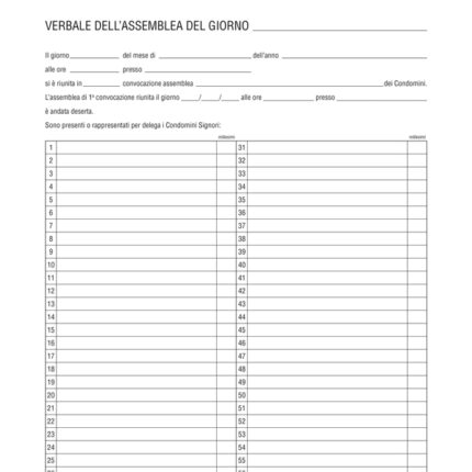 Il registro dei verbali di assemblea dei condomini è un documento nel quale l’amministratore di un condominio deve verbalizzare quanto discusso nelle assemblee. Questo registro è reso obbligatorio dall’art. 1136 del codice civile e ai sensi dell’art. 1130 è d’obbligo da parte dell’amministratore prendersene cura. Questo documento è disponibile nel formato 31 x 24,5 cm con foliazione a 96 pagine.