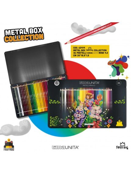 Metal box Collection FrafFrog e TintaUnita. Astuccio in metallo con 36 pastelli a matita 4.2mm. Una mina più grande, per un grande artista! Il massimo della qualità, per dare più colore ai tuoi disegni.