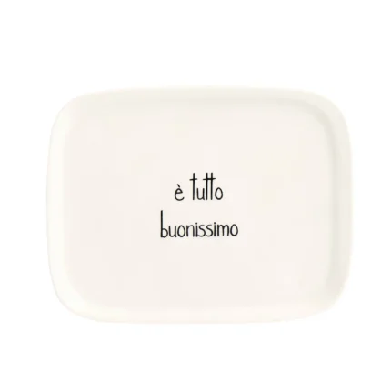 Come tutti i prodotti in gres si può lavare in lavastoviglie Bordatura rialzata Usa la creatività per servire in tavola qualcosa di speciale Dimensioni: 20x15.5 cm Decoro E' tutto buonissimo Disegnato in Italia