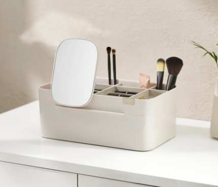 Elegante e compatto, con specchio integrato e ampi scomparti per cosmetici.