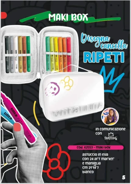 Scopri il kit creativo perfetto con l’Astuccio One Time Art Markers Tinta Unita: un set di 24 marker acrilici dai colori brillanti e coprenti, ideali per decorare plastica, vetro, tessuto, ceramica, legno e carta. L’astuccio bianco dal design minimalista ed essenziale è pensato per essere personalizzato e decorato con gli stessi marker inclusi, trasformandosi in una vera tela creativa. Compatto, resistente e facile da trasportare: tutto ciò che serve per creare ovunque, in totale libertà. Perfetto per artisti, creativi, studenti e amanti del fai da te, questo set unisce funzionalità e fantasia in un unico prodotto. Un’idea regalo originale per chi ama disegnare, colorare e personalizzare ogni oggetto. L'astuccio contiene: 24 marker acrilici a tinta unita ad alta coprenza, che scrivono su molteplici superfici: plastica, vetro, tessuto, legno, ceramica, carta. Astuccio personalizzabile e resistente Ottimo per DIY, decorazioni, scrapbooking e progetti artistici