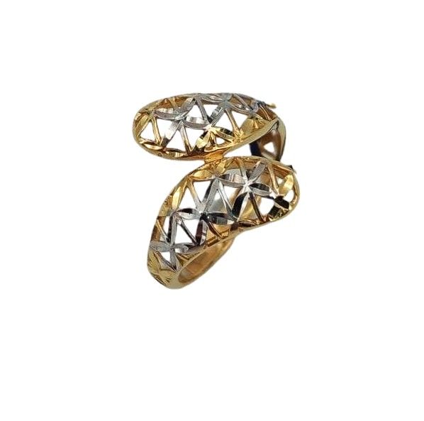 Grazioso anello in oro 18 kt,  in oro giallo e bianco sfaccettato a donare un luminoso un effetto brillantinato.