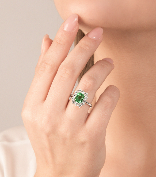L’Anello Visconti Smeraldo Medio è caratterizzato da questa splendida gemma dal taglio quadrato centrale, attorniato da un luccicante contorno di diamanti.