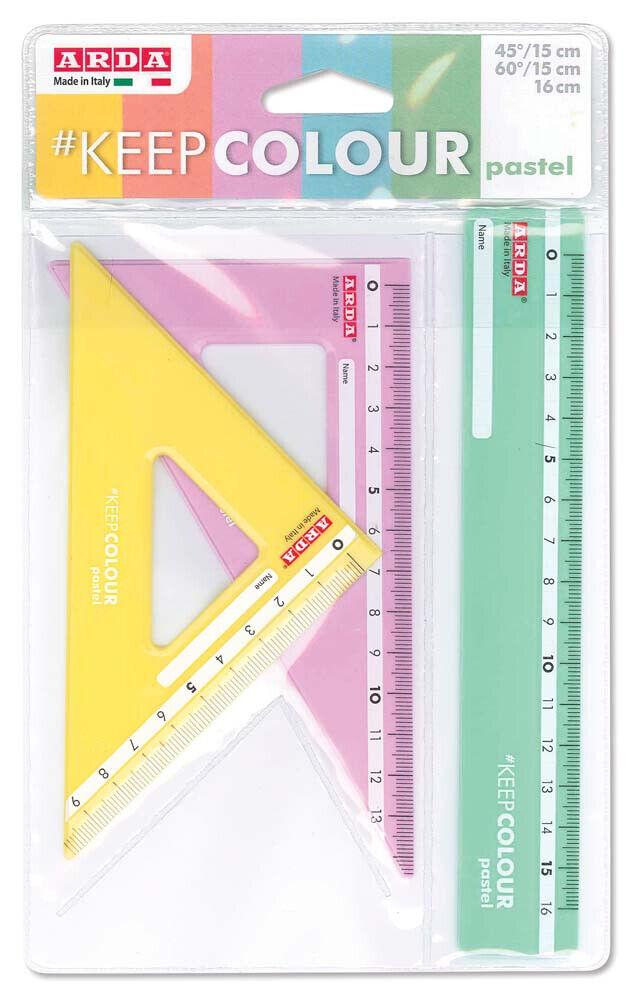 Il set disegno Mini Kit Keep Colour Pastel è composto da una squadra 45° 15 cm, una squadra 60° 15 cm e un righello 16 cm in colori pastello. Il set contenuto nella sua busta è comodo da trasportare e resistente, perfetto per resistere agli anni scolastici sballottato di cartellina in cartellina. Dai colori pastello, le 2 squadre e il righello sono i complementi perfetti per i disegni tecnici di precisione.