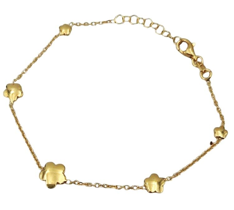 Delicato, luminoso e dal design romantico, questo bracciale in argento dorato è arricchito da cinque graziosi fiori che lo rendono un accessorio elegante ma discreto. Perfetto da indossare ogni giorno, aggiunge un tocco di femminilità e luce al polso.