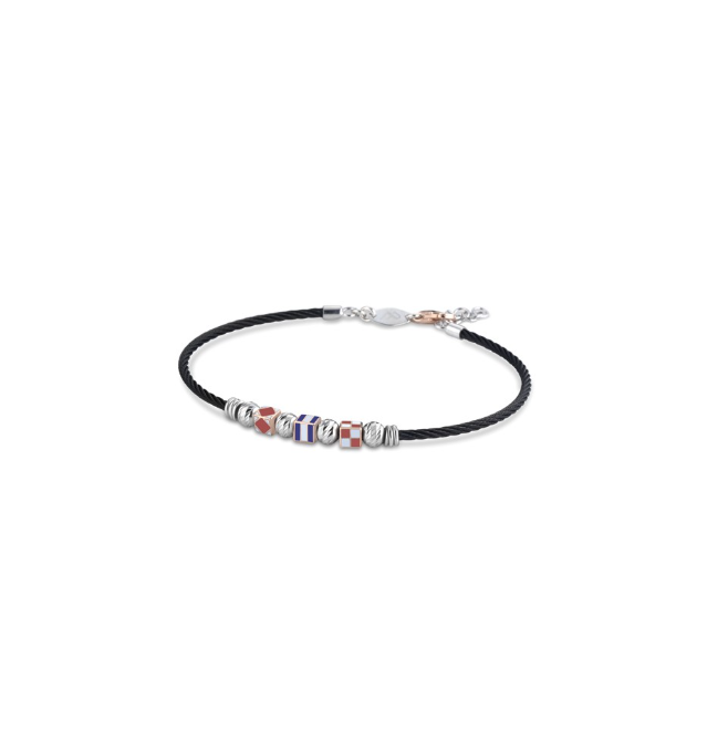 La base del bracciale è in argento brunito modello corda, nel mezzo tre dadini nautici si alternano a quattro sfere sfaccettate in argento bianco