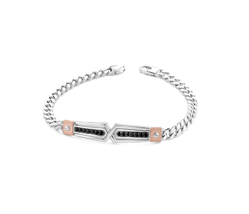 La base del bracciale  è composto dalla classica catena in argento e nel mezzo una barretta in argento rosa con due linee di zirconi neri incastonati
