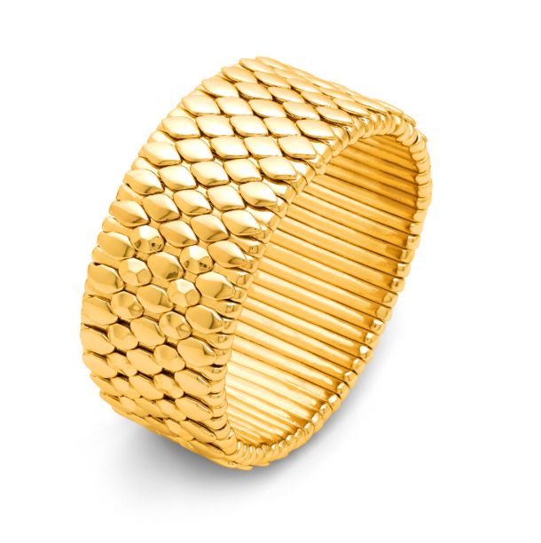 Il bracciale si compone di una texture dinamica e contemporanea, capace di catturare la luce e suggerire un dinamismo visivo unico. La presenza di molle interne nascoste garantisce una vestibilità confortevole. Un gioiello fatto a mano, espressione dell’arte orafa e della maestria artigianale di Giovanni Raspini.