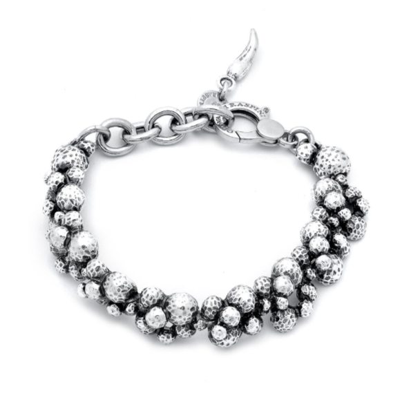 Un bracciale unico, caratterizzato da sferette in argento brunito ad effetto martellato che si rincorrono, catturando e riflettendo la luce in modo particolarissimo. Questo gioiello racconta tutto il fascino antico e contemporaneo della fusione a cera persa. Realizzato completamente a mano in azienda.