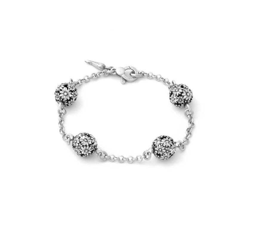 Argento vivo da indossare ogni giorno. Questo bracciale Raspini Margherite Shine monta quattro boule ricoperte di bellissime piccole margherite in argento, alternate ad una catena rolò. Ogni petalo dei fiori, creati con la tecnica della cera persa, è rifinito a mano con una diamantatura che rende ancora più intensa la luminosità del gioiello, per un indosso semplice, ma estremamente raffinato.