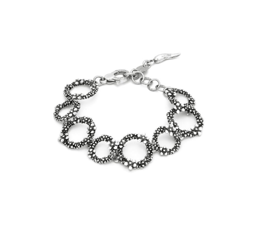 Il bracciale Raspini Millefiori rappresenta l’eleganza leggera da indossare al polso. La lavorazione artigianale della fusione a cera persa su argento brunito, è abbinata in questo bracciale all’effetto della diamantatura, che conferisce ai minuscoli e graziosi petali un effetto scintillante.