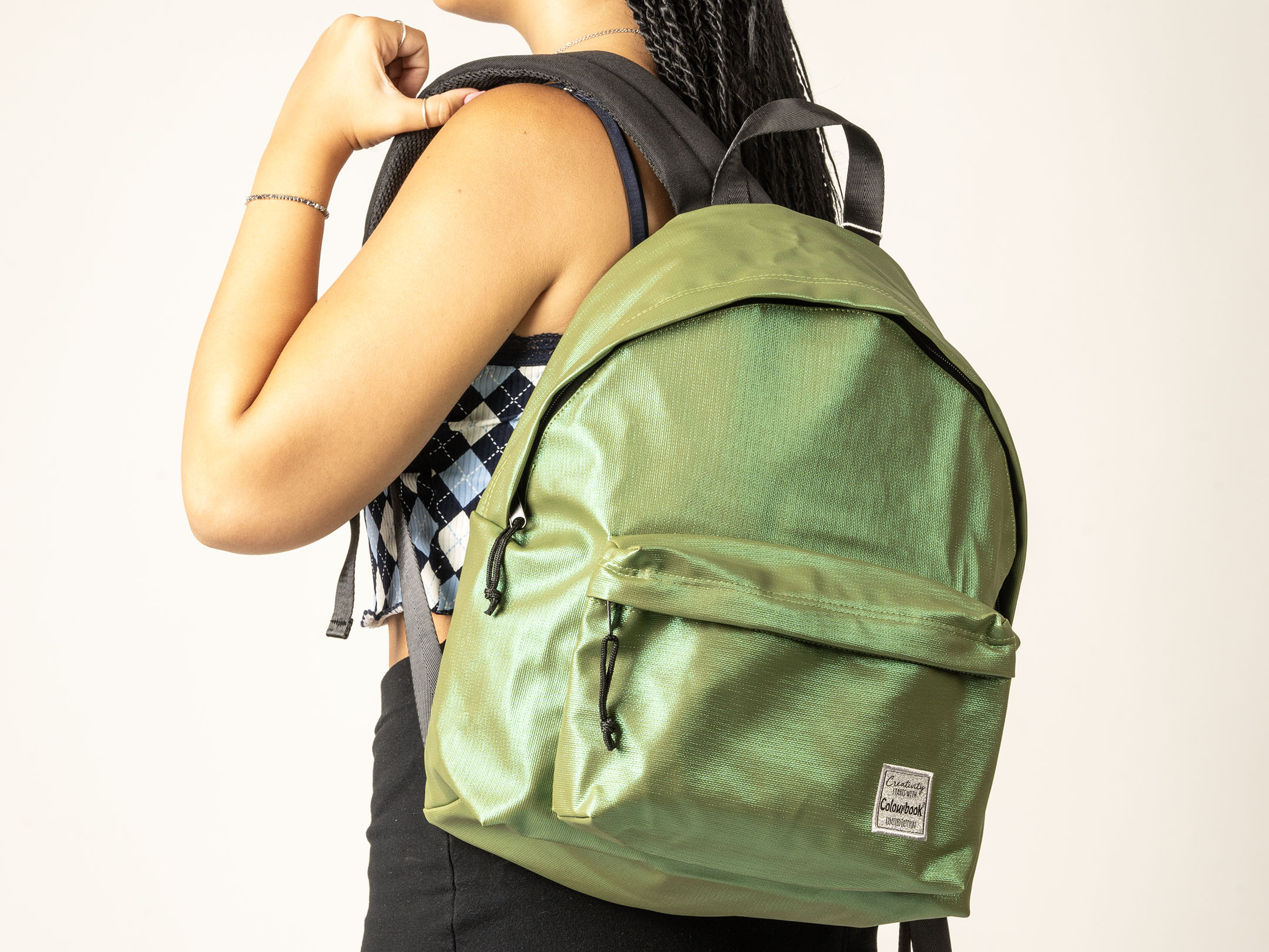 Brilla come una vera stella con lo zaino Colourbook della linea Shine. Lo zaino dal design audace è realizzato con tessuto brillante in otto varianti di colore: forest, strawberry, ocean, ivory, night, pearl, brown gold e cloud.