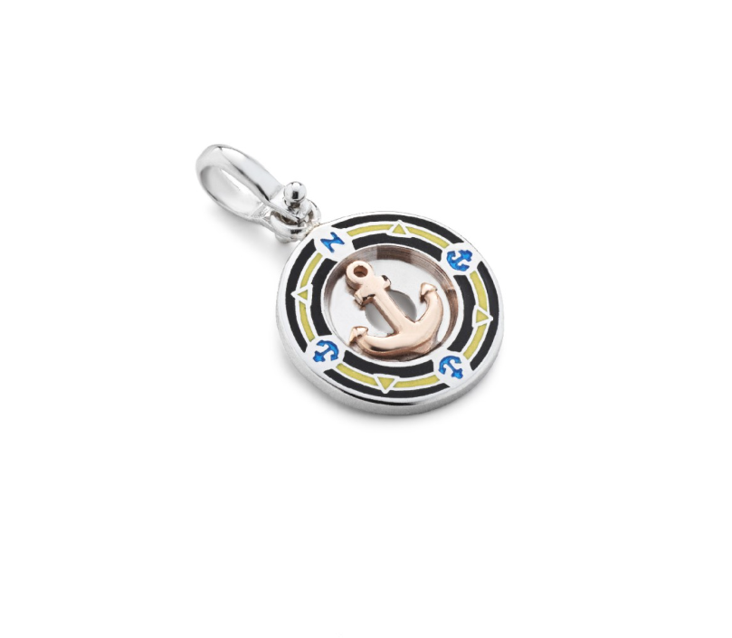 Un’ancora in argento placcato rosa inserita in un cerchio sul quale sono impressi a smalto i quattro punti cardinali.