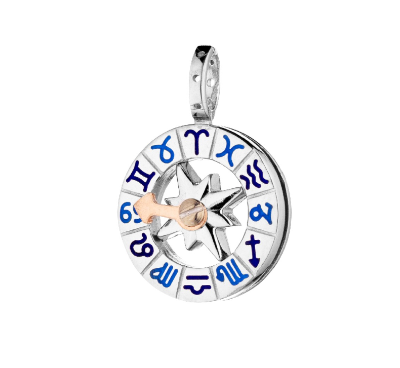 Una freccia in argento placcato rosa rotea attorno ad un cerchio ad indicare uno dei dodici segni zodiacali disegnati con smalti blu ed azzurri.
