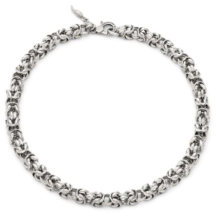 Un capolavoro di maestria artigianale firmato Giovanni Raspini, la collana Bizantina Luce reinterpreta l’iconica catena bizantina conferendole luminosità e matericità. La particolare sfaccettatura delle maglie, realizzata a mano, crea suggestivi giochi di luce e riflessi, donando all’intero gioiello una brillantezza unica. Realizzata a mano in azienda.