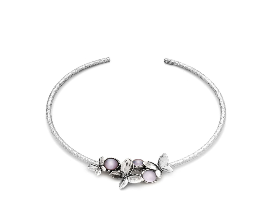 L’elemento tubolare in argento martellato e le delicate nuance rosa delle pietre cabochon danno vita questa collana realizzata completamente a mano. Il volo della farfalla si fa gioiello contemporaneo.