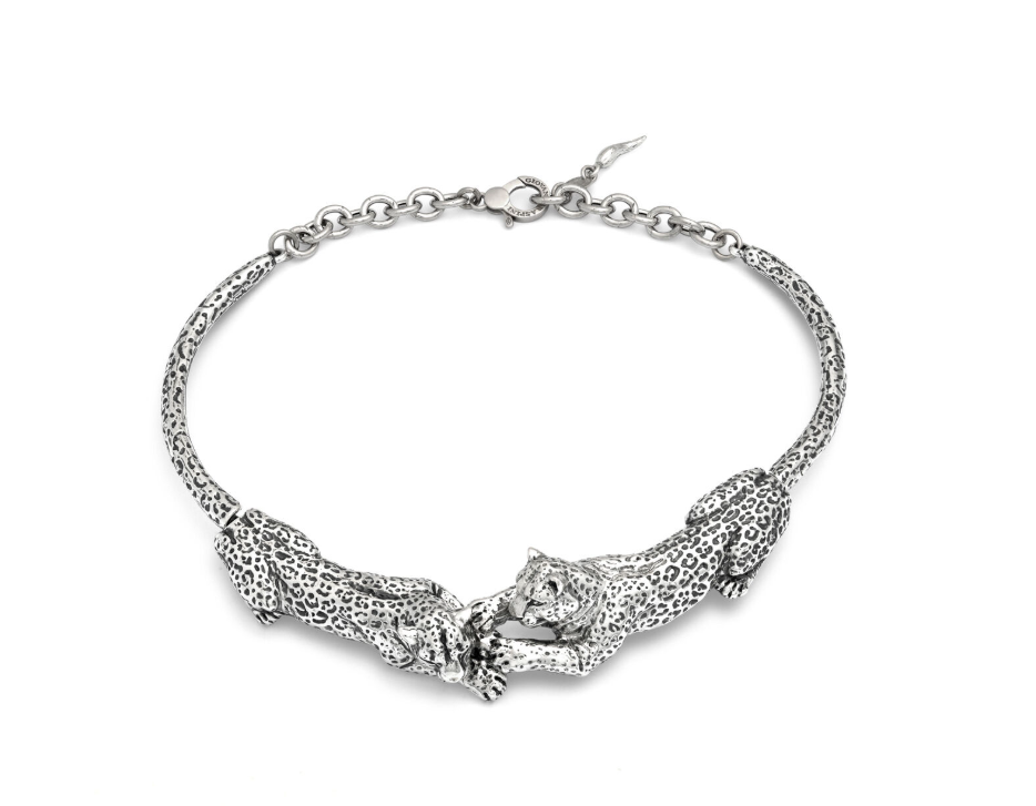 Raffigurante due leopardi adagiati uno di fronte all’altro, in un’armoniosa posa che evoca forza ed eleganza, questa meravigliosa collana è interamente realizzata dai nostri artigiani tramite l’antica tecnica della fusione a cera persa. Questo gioiello è composto da quattro elementi con snodi invisibili che rendono l’indosso particolarmente confortevole. La brunitura dell’argento enfatizza la texture del manto del felino, in una combinazione perfetta di volumi e luminosità.