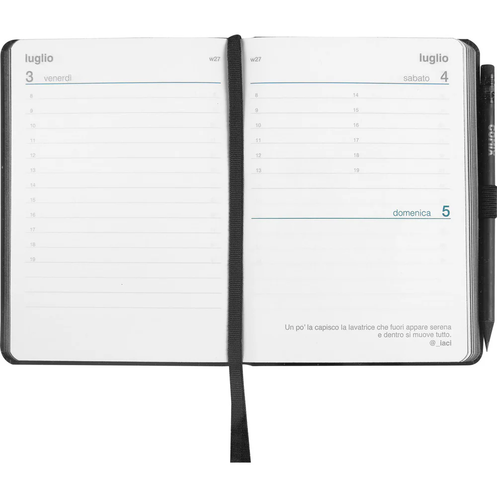 LAYOUT GIORNALIERO: Visualizzazione chiara di 7 giorni su due pagine con ampio spazio per annotazioni e appuntamenti