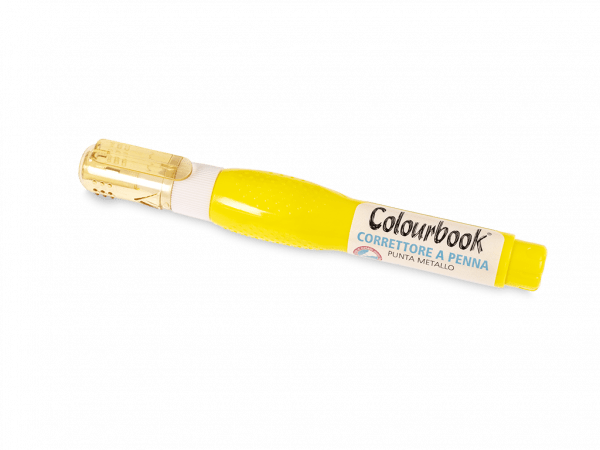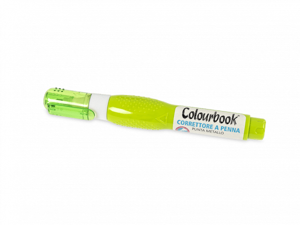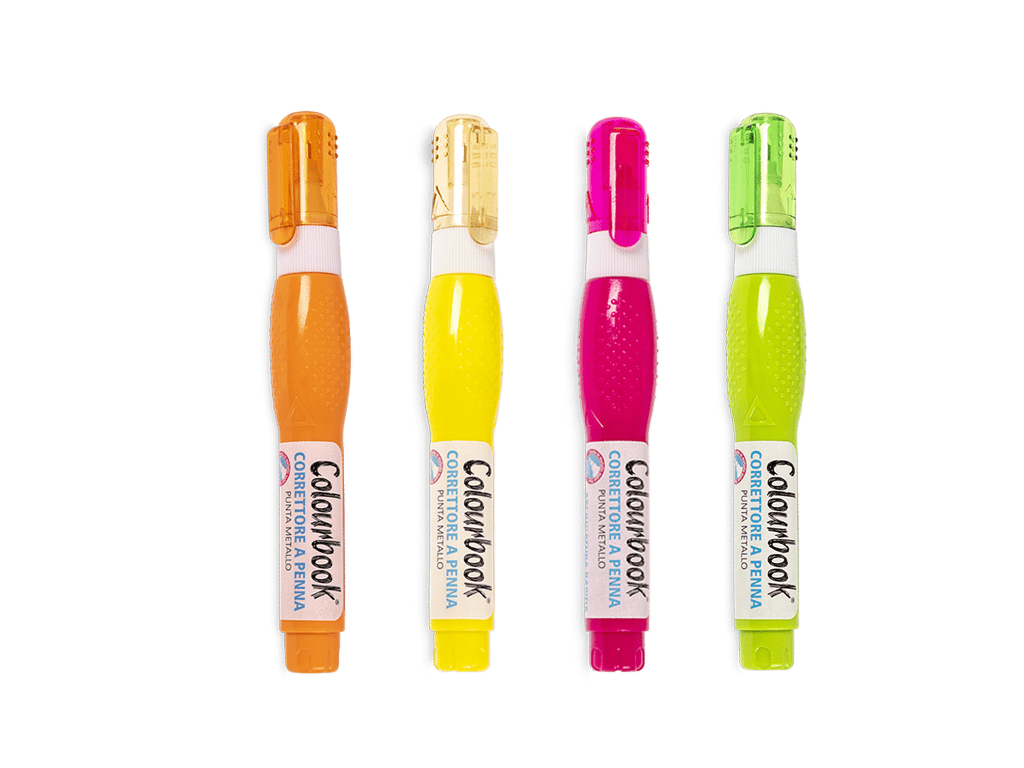 Correttore a penna con punta in metallo e fusto colorato da 7 ml. Scrivi, cancella e riscrivi quante volte vuoi e lasciati avvolgere dai nuovi colori fluo Colourbook.