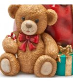 Elegante base in resina per albero di Natale a forma di orsetto con sacchetto e pacchetti regalo.