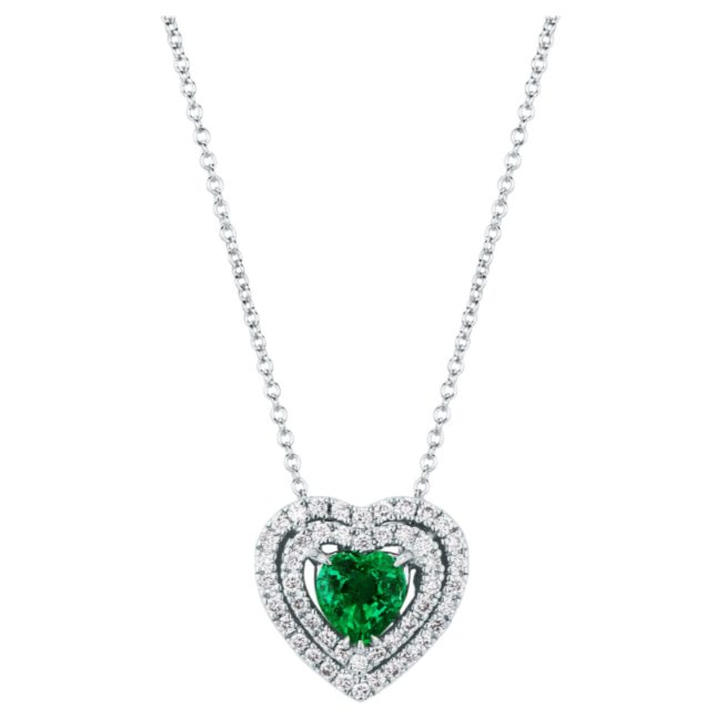 Il pendente, dalla forma classica e amata, è realizzato con maestria: al suo cuore batte uno smeraldo centrale taglio cuore, una pietra preziosa dal colore profondo e vellutato.