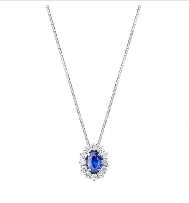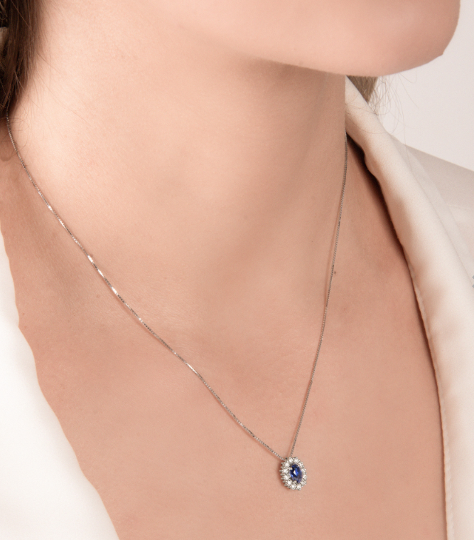 Il Girocollo Goccia Zaffiro Medio di Mirco Visconti è caratterizzato da questa splendida gemma dal taglio ovale, con un contorno di diamanti della migliore qualità.