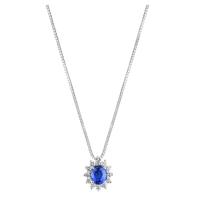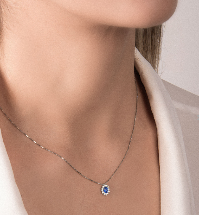 Il Girocollo Goccia Zaffiro Piccolo di Mirco Visconti è caratterizzato da questa splendida gemma dal taglio ovale, con un contorno di diamanti della migliore qualità.