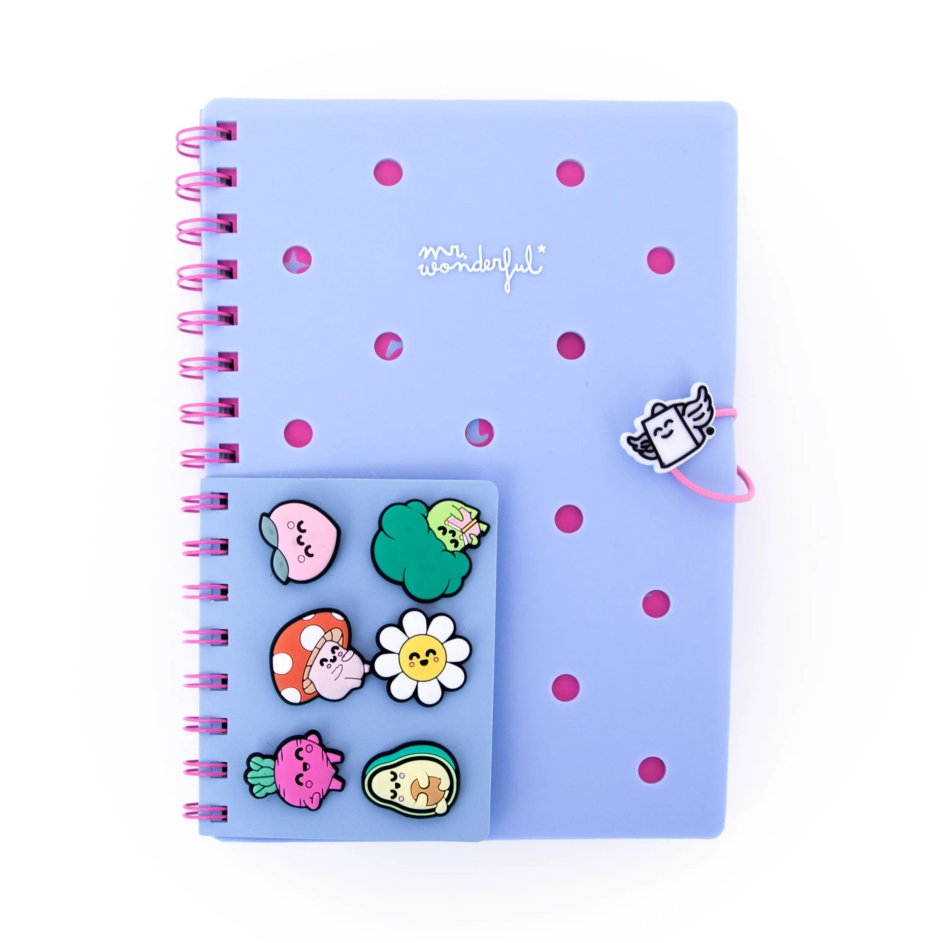 Quaderno formato A5 con rilegatura a spirale. Include una copertina con fori e un set di 7 simpatici charms in gomma per decorarla. Questi charms possono anche essere usati per personalizzare zoccoli tipo Crocs.