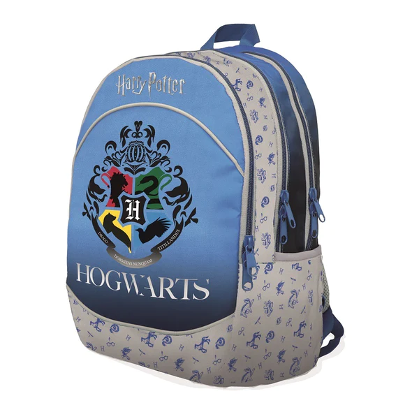 Zaino tre cerniere Harry Potter. Tessuto poliestere 600 in colore blu con sfumature in gradazione più scura. Comparto frontale con stampa serigrafica argento del logo e stampa transfer dello stemma e della scritta Hogwarsts. Stampa serigrafica in colore blu del pattern sullo sfondo laterale in colore grigio. Schienale e fondo con preformato, piedini di appoggio, maniglia, spallacci imbottiti, regolabili e personalizzati. Tre ampi comparti con chiusura zip.