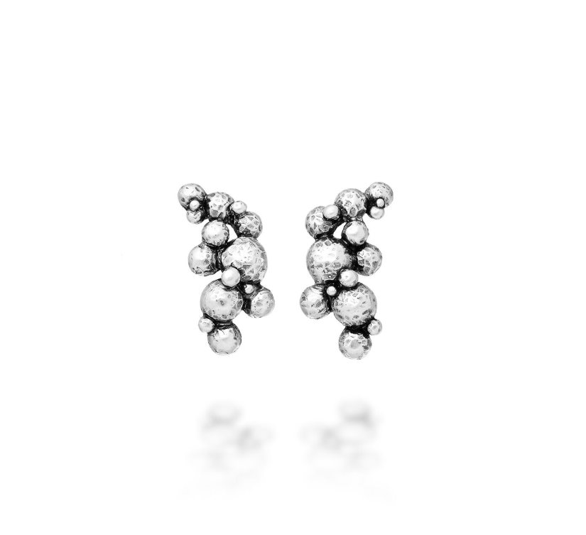 Un gioiello davvero iconico che racconta tutto il fascino della lavorazione con fusione a cera persa. Gli orecchini Bubbles sono una creazione di forte personalità caratterizzata da sferette in argento brunito ad effetto martellato che si rincorrono, riflettendo la luce in modo particolarissimo.