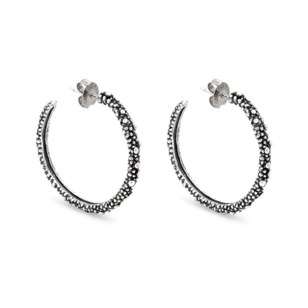 Gli orecchini Cerchio Petit Perlage esprimono l’eccellenza artigianale della fusione a cera persa, celebrata in una forma contemporanea ed essenziale. Il pavé di sferette in argento brunito, finemente diamantato, dona affascinanti giochi di luce. Realizzati interamente a mano in azienda.