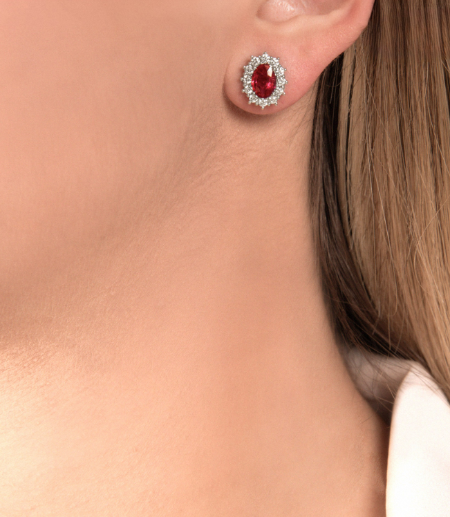 Gli Orecchini Visconti Rubini contorno sono caratterizzate da queste splendide gemme dal taglio ovale centrale, circondate da contorno di diamanti della migliore qualità