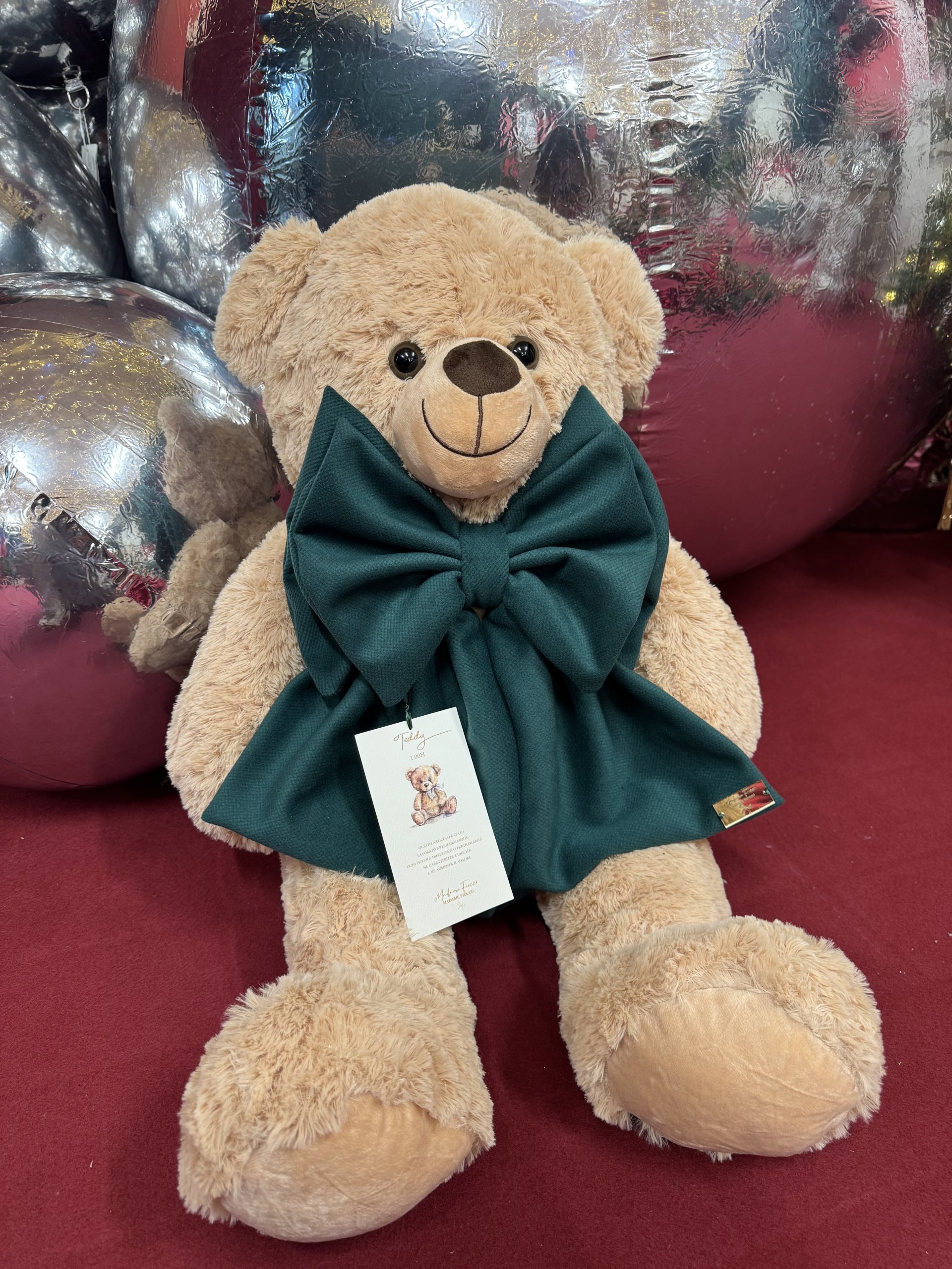 Tenerissimo teddy peluche con fiocco in velluto verde realizzato a mano da Madame fioccò.