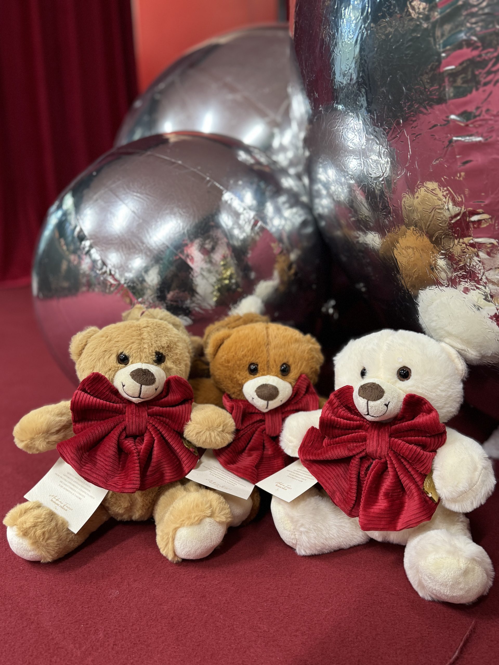 Tenerissimo teddy peluche con fiocco in velluto rosso realizzato a mano da Madame fioccò.
