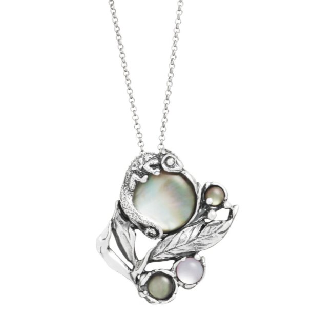 Tutta la forza animalier di Giovanni Raspini in questo pendente in argento, fuso a cera persa e brunito, dove un camaleonte avvolge con grazia il castone principale, contornato da altri elementi naturali. Quattro gemme in taglio cabochon impreziosiscono questo gioiello: una grande madreperla grigia doppiata con quarzo, affiancata da altre due gemme dello stesso tipo, ma più piccole, ed una madreperla rosa sempre doppiata con quarzo. Completa il gioiello una catena micro rolò diamantata da 80 cm. Interamente fatto a mano in azienda.
