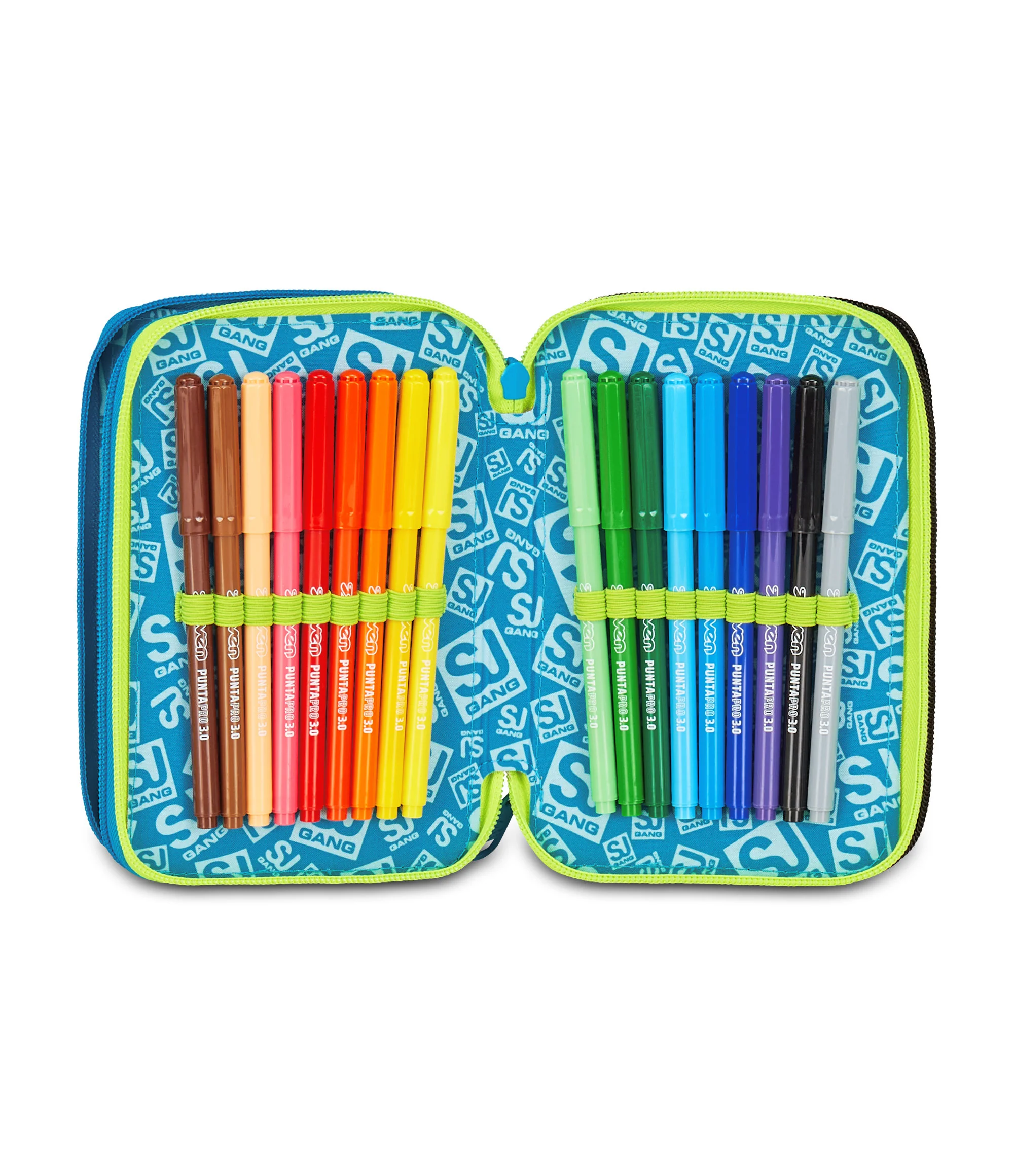 Ciao! Sono il coloratissimo Astuccio 3 zip SJ Gang. Dotato di 3 scomparti completi di tutto il materiale necessario per fare al meglio i tuoi lavori di scuola, puoi abbinarmi a uno zaino o a un trolley SJ Gang.
