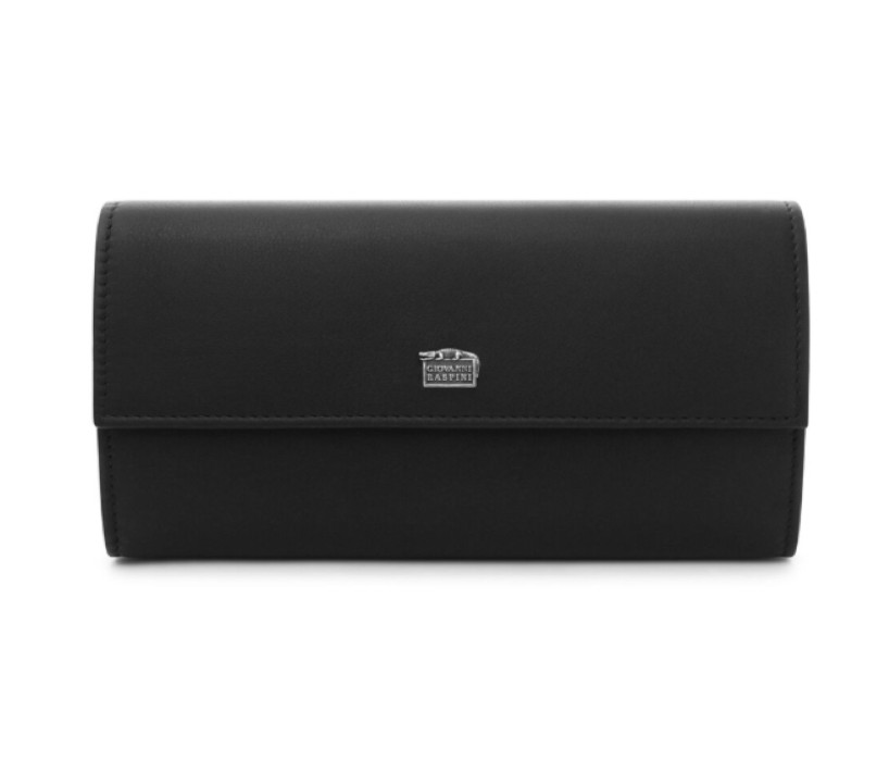 Un portafoglio capiente ed elegante, realizzato in pregiata pelle di vitello pieno fiore liscia nera. Il modello è progettato per mantenere ogni cosa perfettamente organizzata ed offre ben 12 scomparti per carte di credito, due ampie tasche a soffietto per le banconote, una tasca portamonete con chiusura a zip: il tutto è protetto da una patta con chiusura a bottone, che nasconde anche una tasca supplementare. Questo prodotto rappresenta la massima eccellenza artigianale che da sempre contraddistingue il brand Giovanni Raspini, ed è impreziosito da un caratteristico elemento in Argento 925, realizzato in fusione a cera persa e raffigurante il logo del brand in miniatura, sovrastato dall’iconico coccodrillo. Lavorato interamente a mano in Toscana.