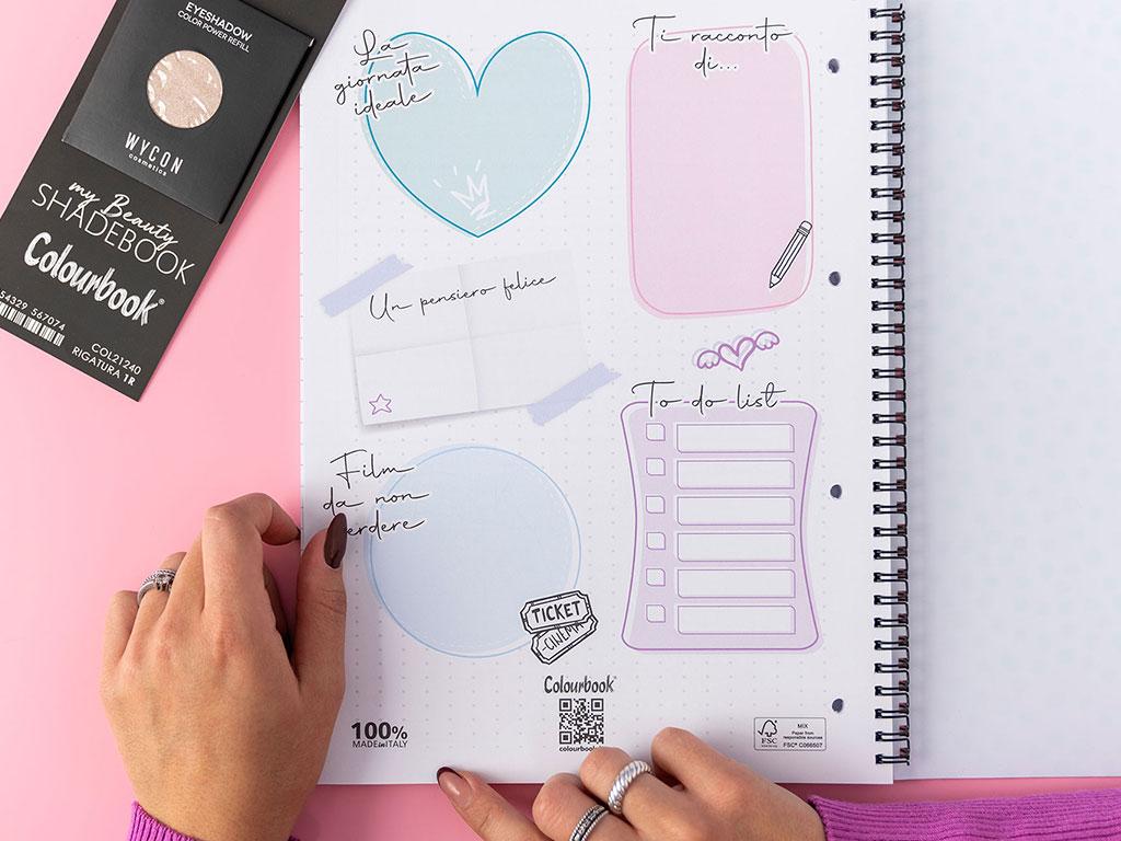 I quaderni spiralati Colourbook per Wycon Cosmetics sono un must-have per chi ama colorare il mondo attorno a sé. Il fiore all’occhiello? Le pagine speciali in cui segnare progetti importanti, obiettivi del mese o le tue serie tv preferite!