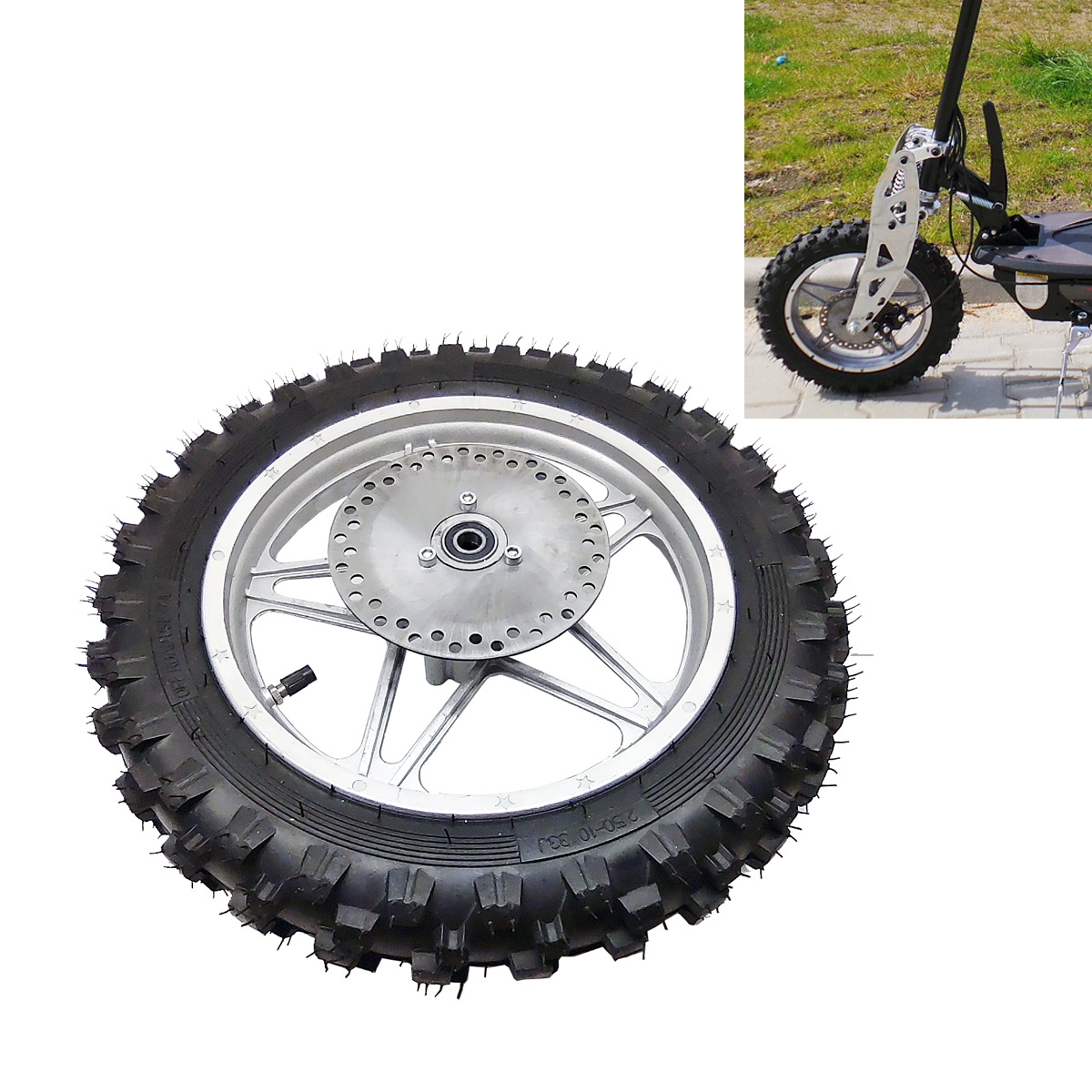 ruota 2.50-10 anteriore completa di (copertone off road + camera daria + cerchio in lega + disco freno + serie di cuscinetti per il mozzo). Specifica per monopattino elettrico Viron 1000w, Ncx Tigershark, monopattino Extreme 1000w, monopattino a scoppio che hanno la ruota da 10″ con freno a disco sul lato sinistro. Compatibile anche con altri veicoli con tali caratteristiche. Vedi foto per maggiori dettagli. Hai bisogno di aiuto sulla compatibilità? Invia una richiesta