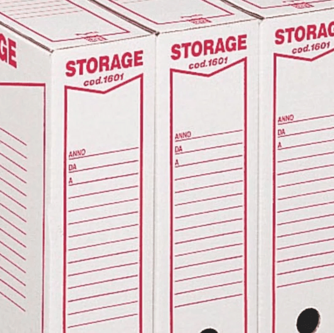 • Realizzata in robusto cartone bianco stampato ad acqua, la scatola Storage è archiviabile in senso verticale o orizzontale ed ha un foro di presa sia sul lato lungo che sul corto e uno spazio per la descrizione del contenuto su tutti i lati.