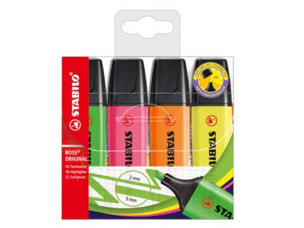 Evidenziatori Stabilo Boss Conf. da 4 Pz. Colori Fluo - Set da 4, colore del tratto: giallo, verde, arancione e rosa.